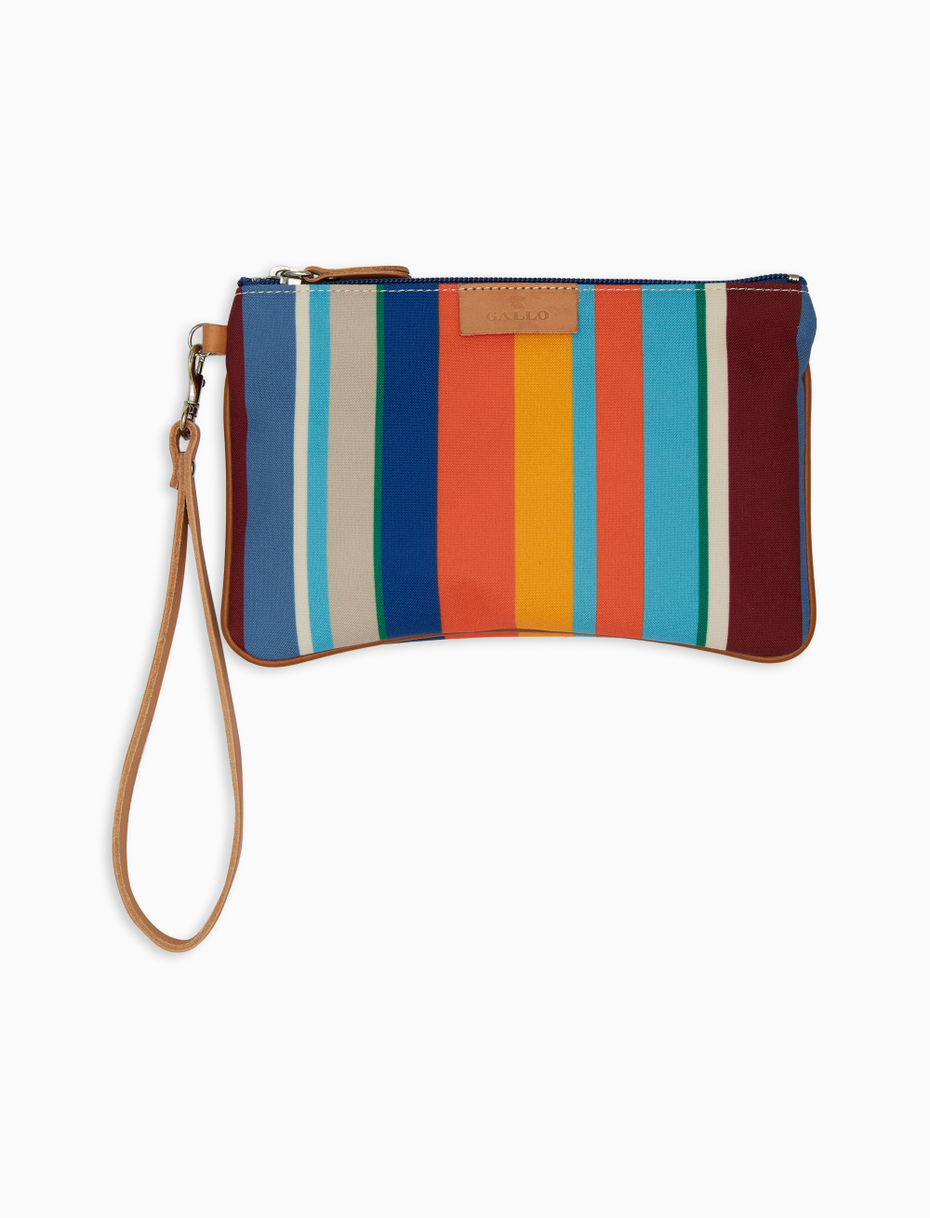 Pratica ed originale pochette bauletto unisex in fibra sintetica, realizzata in Italia con grande cura per i dettagli. Iconica trama a righe multicolor Gallo, che la contraddistingue già dal primo sguardo. Fantasia sui toni del blu royal, può essere utilizzata come porta oggetti o beauty-case, per avere tutto il necessario sempre con se.
