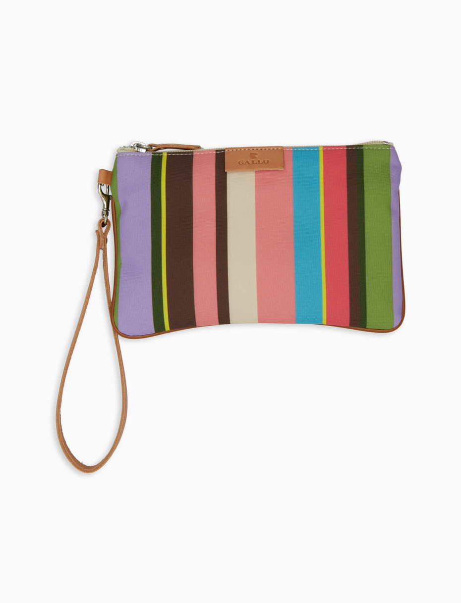 Pratica ed originale bustina unisex in fibra sintetica, realizzata in Italia con grande cura per i dettagli. Iconica trama a righe multicolor Gallo, che la contraddistingue già dal primo sguardo. Fantasia sui toni del geranio, facilissima da abbinare, per avere tutto il necessario sempre con se.